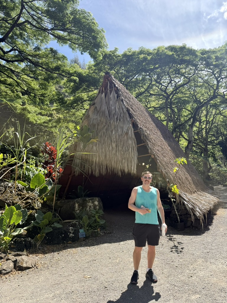 We wandered through huts once used as sacred spaces by men, and others where families slept. Inside one hut, we learned the phrase Malama, meaning “to nurture and protect,” and even received a pin to commemorate our educational efforts!